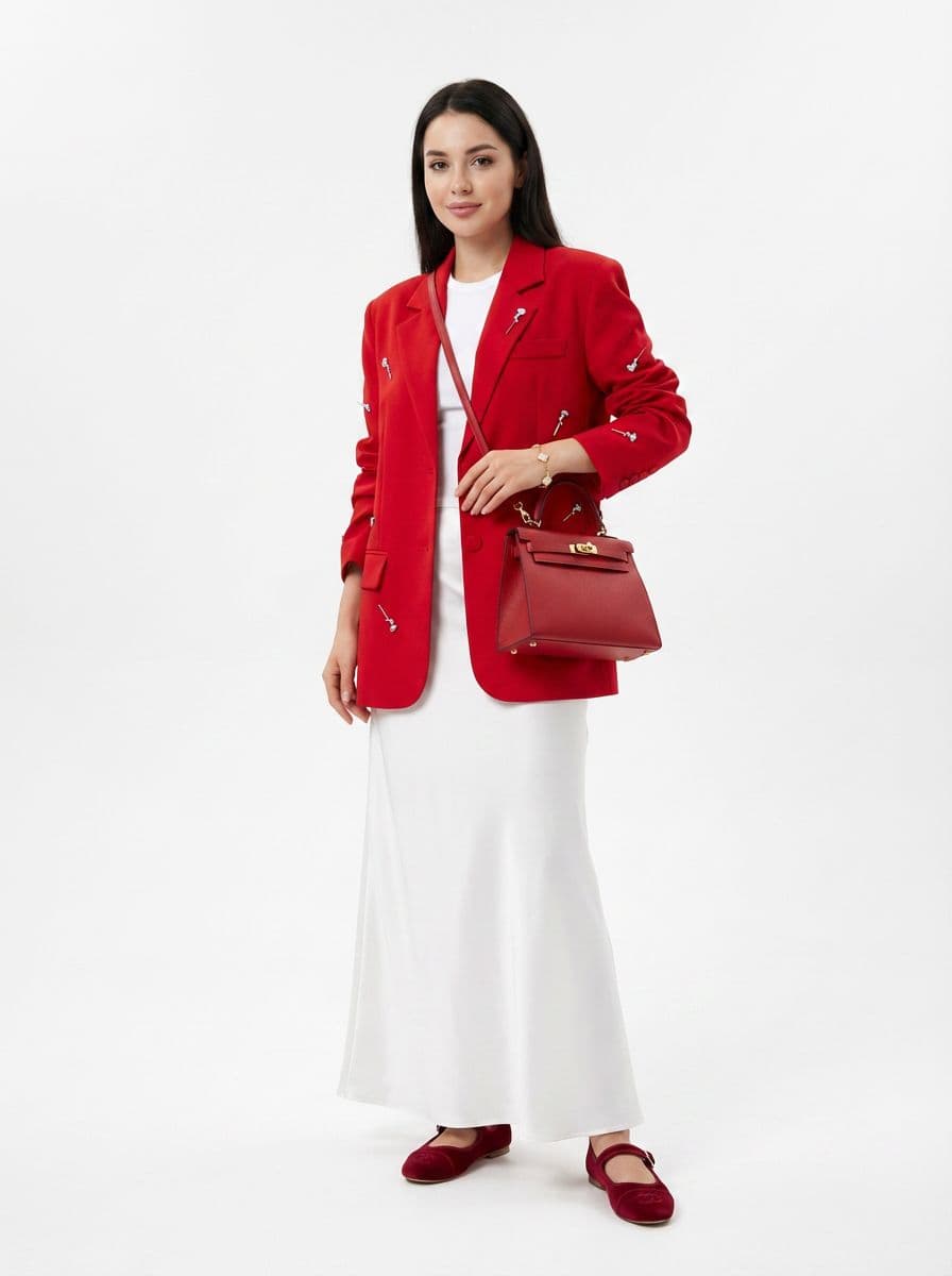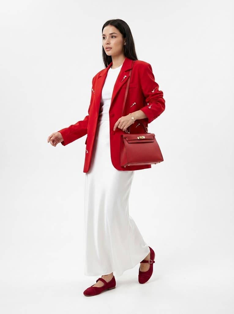 Красный оверсайз жакет и белая атласная юбка создают роскошный образ для свидания или вечеринки. Балетки Мэри Джейн и сумка кроссбоди добавят французского шика вашему праздничному настроению.