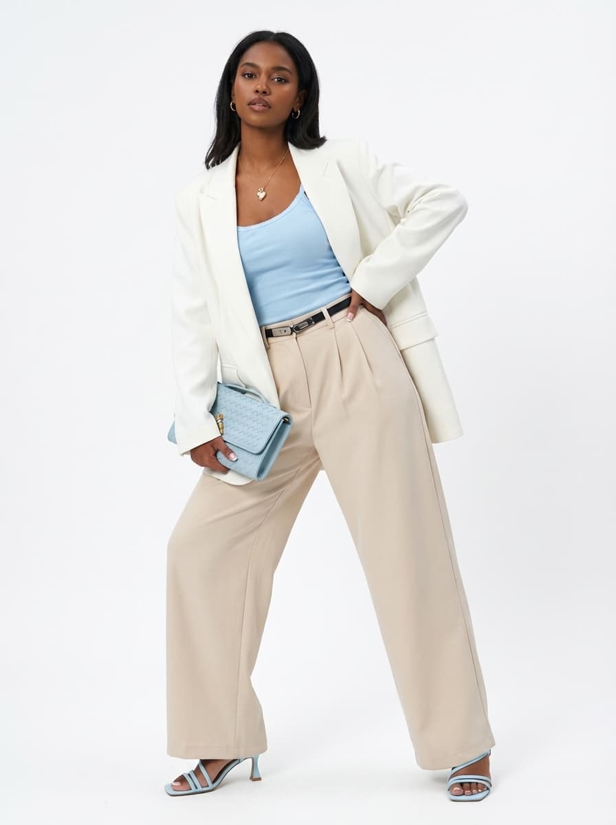 Стильный женский образ с бежевыми палаццо и голубыми акцентами. Идеально для свиданий и прогулок. Оверсайз пиджак и босоножки создают легкое, уверенное и очень нежное настроение.