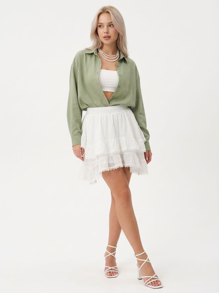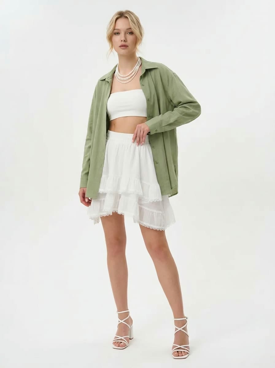 #женский#молочный#женственность#модный лук#стильный аутфит#белый#перламутровый#летний образ#жемчужные бусы#топ бандо#рубашка оверсайз#босоножки на каблуке#асимметричная юбка#наряд на свидание#отпускной стиль#легкая одежда#элегантность