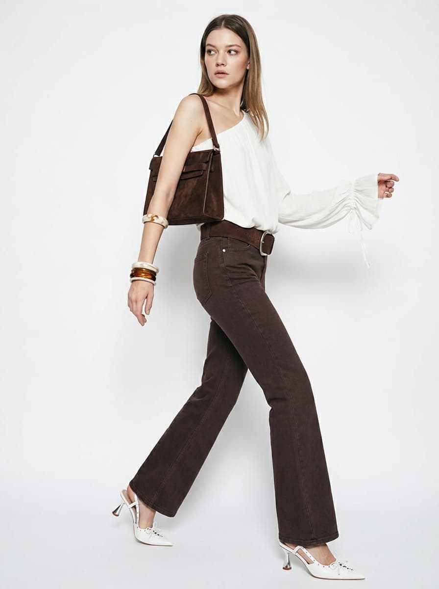 Стильный вечерний аутфит с вискозной блузой и джинсами клеш. Идеально для свиданий и вечеринок. Сочетание денима и изящных слингбэков создает уверенное и романтичное настроение.