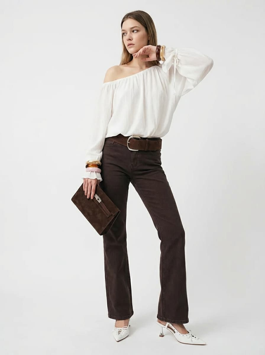 Элегантный образ с блузой на одно плечо и джинсами клеш