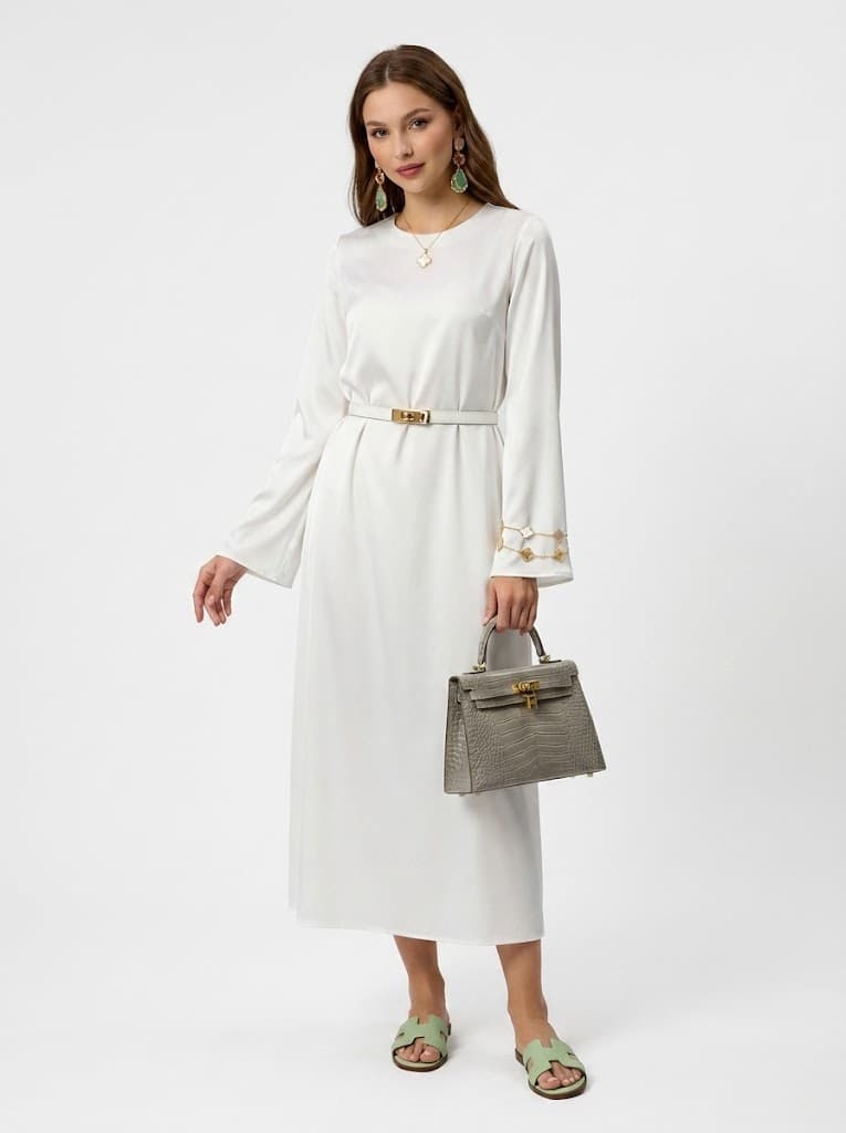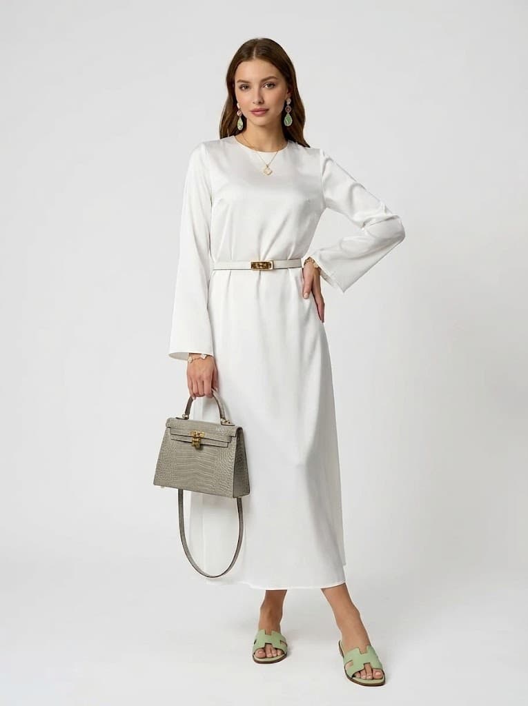 Белое атласное платье и оливковое кимоно создают роскошный вечерний образ для курорта. Идеально для летних вечеринок и свиданий, сочетая в себе шик, минимализм и романтическое настроение.