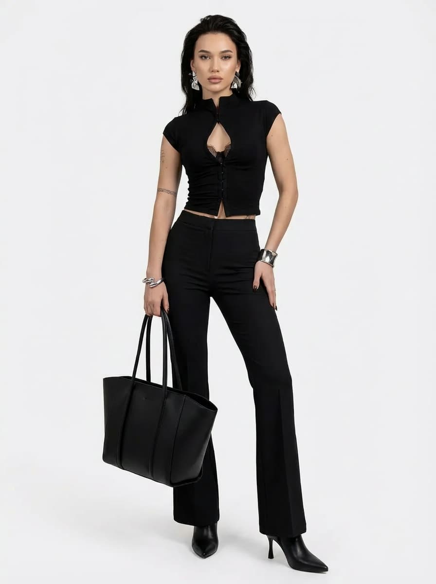 Стильный женский аутфит для свидания или вечеринки. Черный утягивающий топ-корсет, классические брюки клеш и ботильоны-чулки создают эффектный силуэт, дополненный серебристыми аксессуарами.