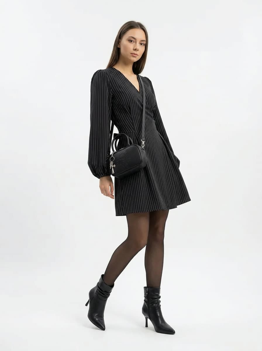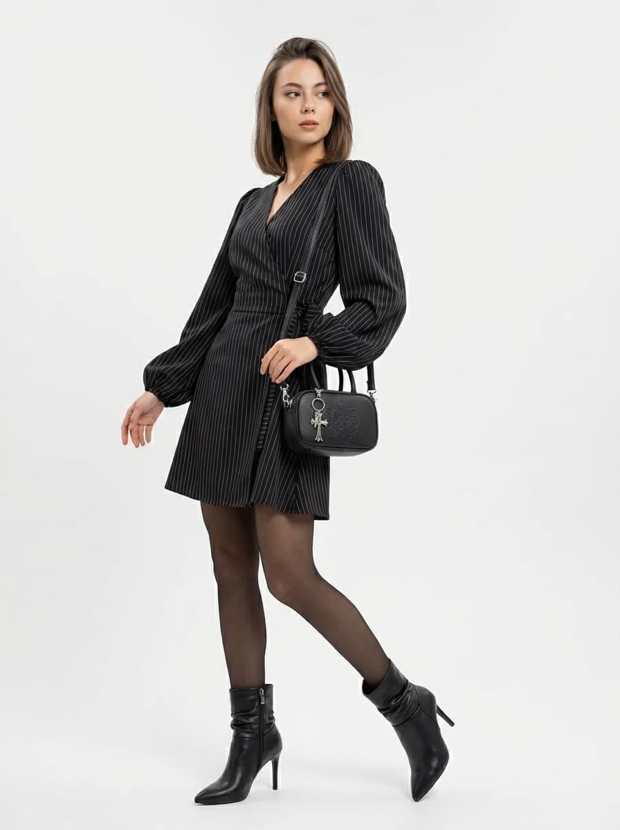 #женский#стильный лук#демисезон#мода 2026#черный#вечерний образ#платье на запах#ботильоны чулки#сумка y2k#хром хартс#классические колготки#праздничный наряд#готика#глэм-рок