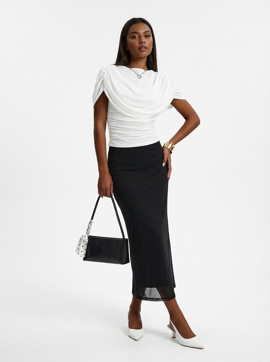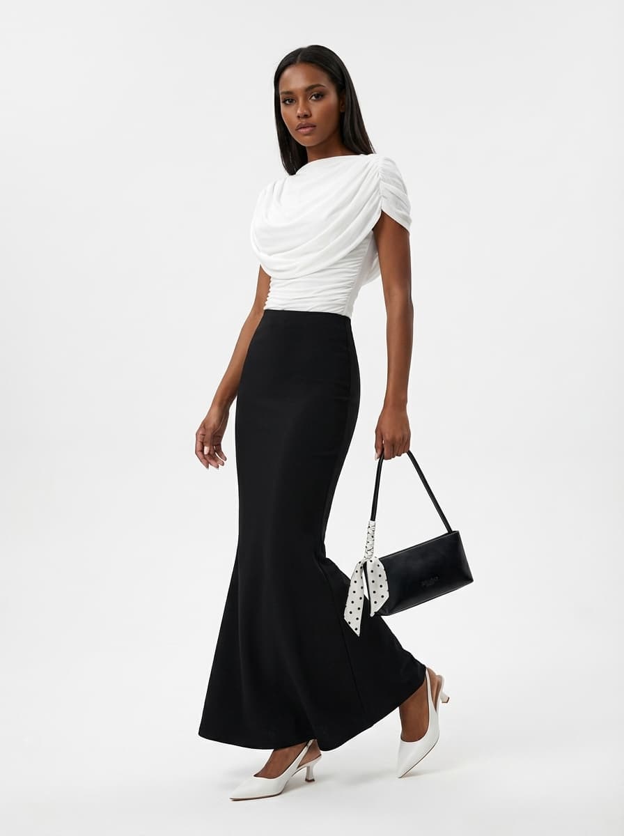 Вечерний образ с топом-кейпом и юбкой годе в изысканном стиле. Элегантный женский наряд для торжества, свидания или фотосессии. Подчеркивает силуэт и создает уверенное, праздничное настроение.