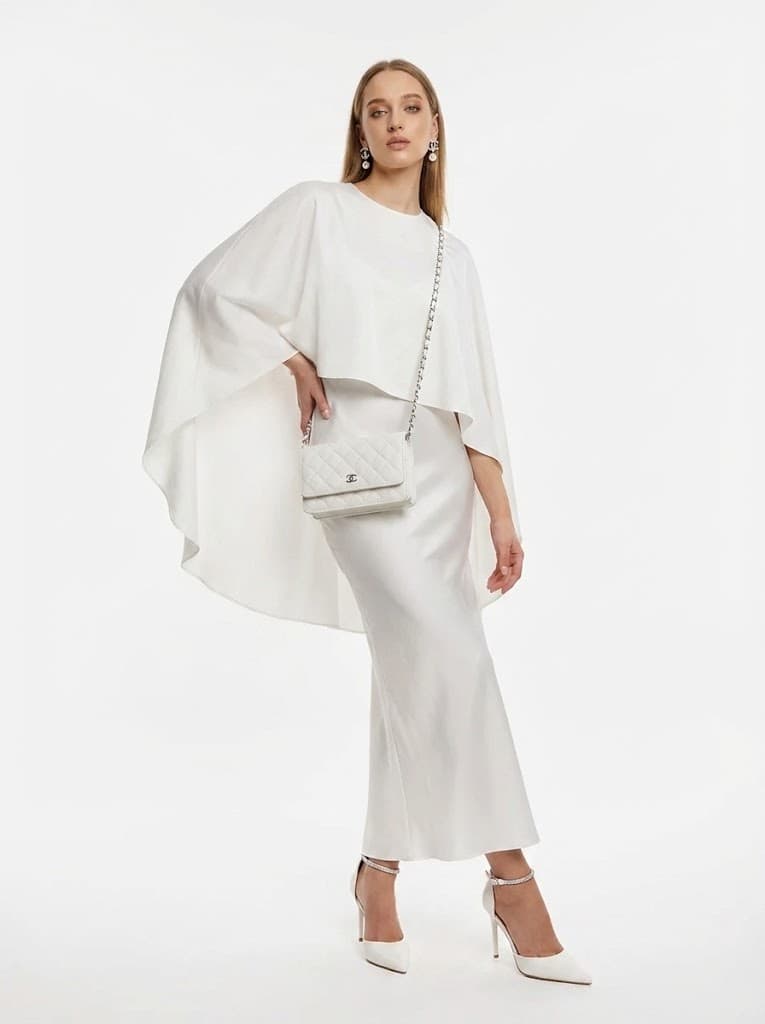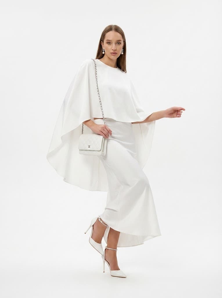 Элегантный вечерний образ в белом цвете с шелковым кейпом