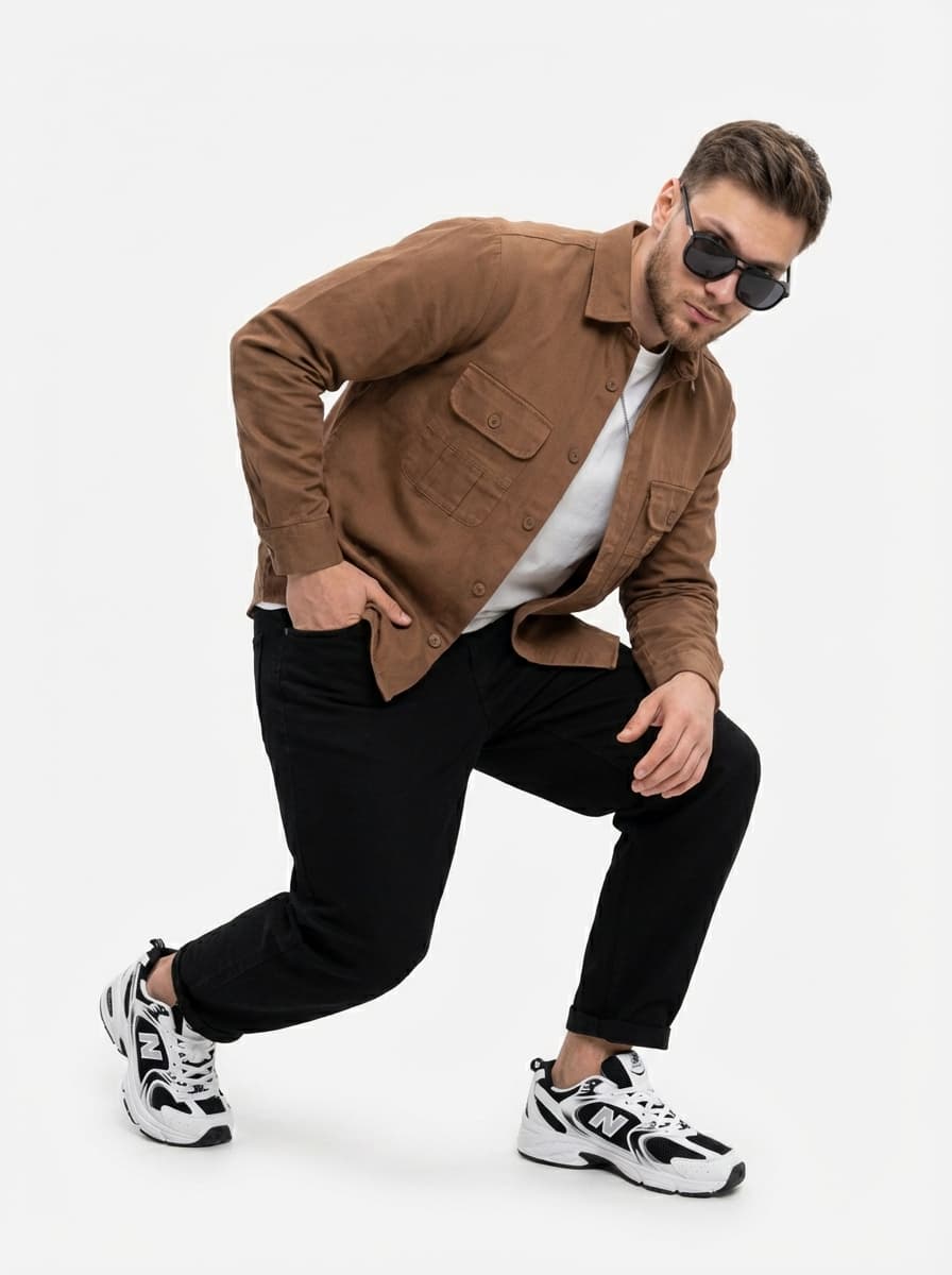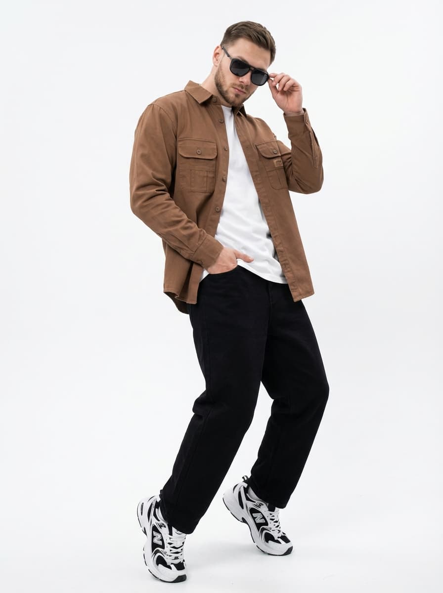 Стильный мужской образ в стиле casual для города. Джинсовая рубашка, джинсы бананы и кроссовки создают расслабленное летнее настроение и безупречный комфорт для прогулок и встреч.