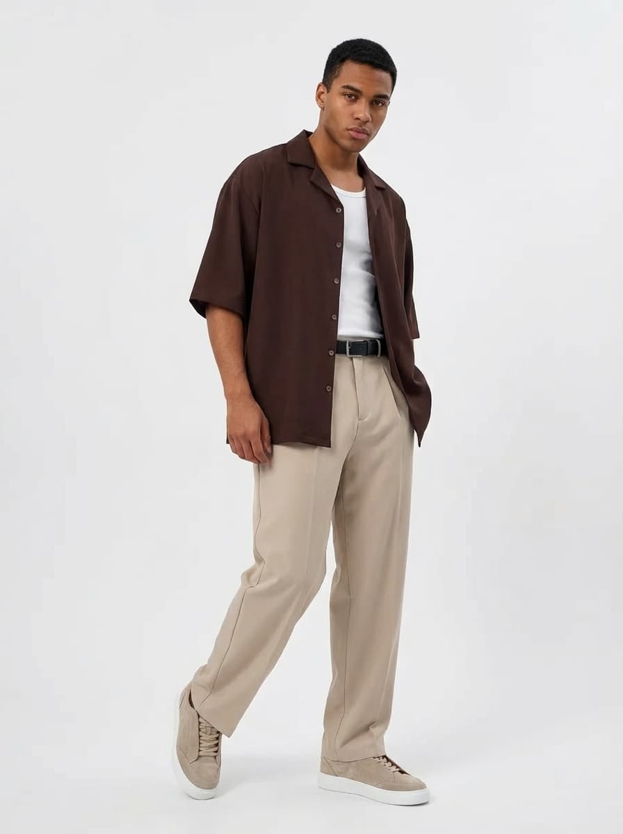 Стильный мужской образ: коричневая рубашка оверсайз, широкие бежевые брюки и замшевые кеды. Идеально для летних прогулок и встреч в городе. Расслабленный casual с ноткой классики.