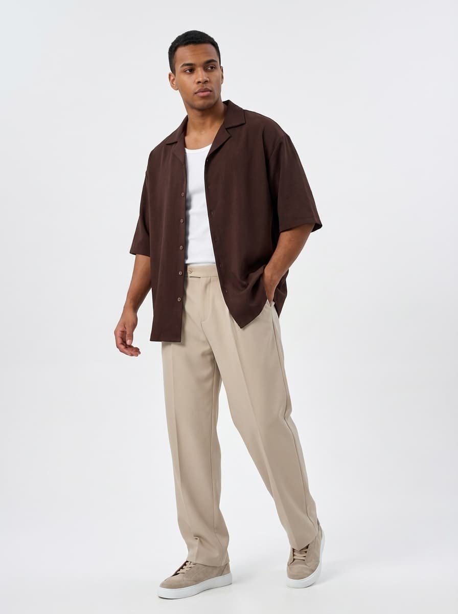 #коричневый#мужской#бежевый#мужская мода#повседневный стиль#белый#летний образ#рубашка оверсайз#базовый гардероб#песочный#широкие брюки#одежда для прогулок#street style#классические брюки#замшевые кеды#хлопковая майка#современный стиль
