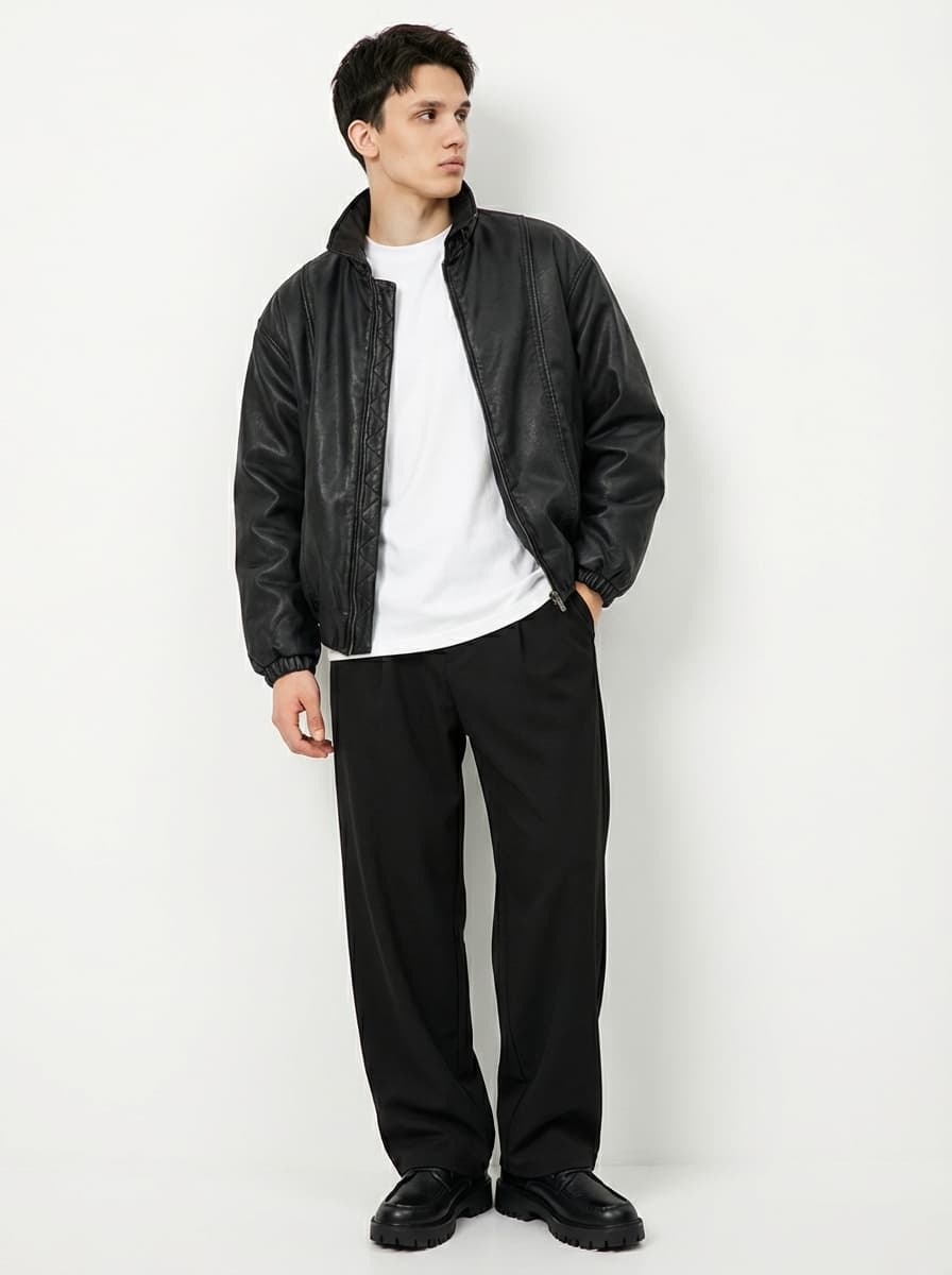 Трендовый мужской образ в стиле минимализм и стритвир. Кожаный бомбер и широкие брюки создают дерзкое настроение для городских прогулок или встреч. Идеальный выбор для демисезона.