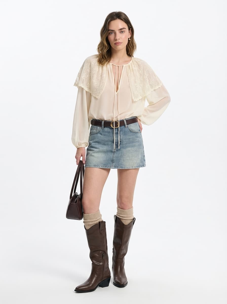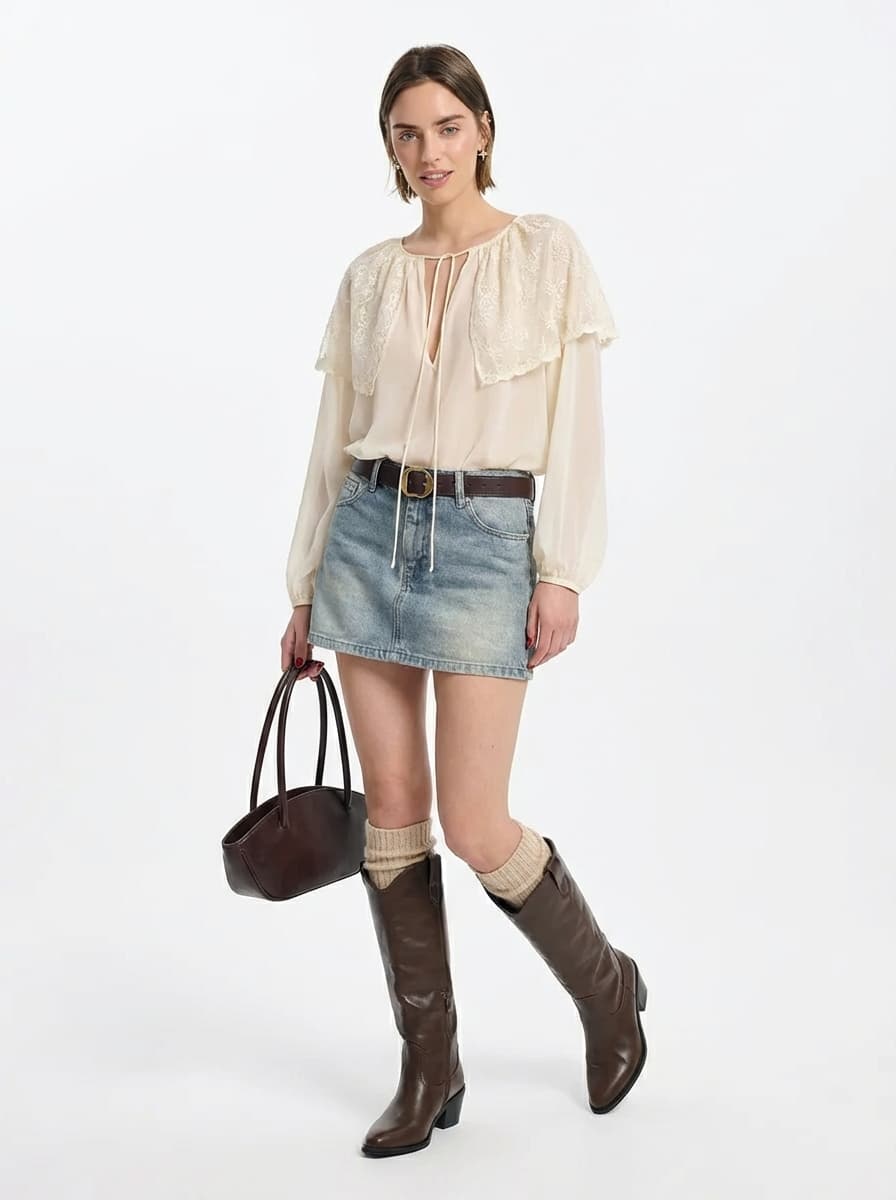 Стильный женский образ в эстетике бохо и Y2K. Кружевная блузка, джинсовая юбка-шорты и коричневые казаки создают романтичное настроение для прогулок и свиданий в демисезон.