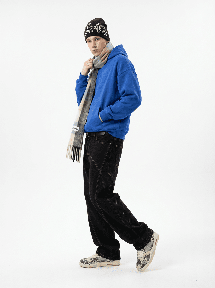 Худи оверсайз и широкие джинсы багги создают дерзкий уличный стиль. Лук дополнен Nike Air Jordan 5 и шарфом Acne Studios. Идеально для городских прогулок и встреч в расслабленной атмосфере.