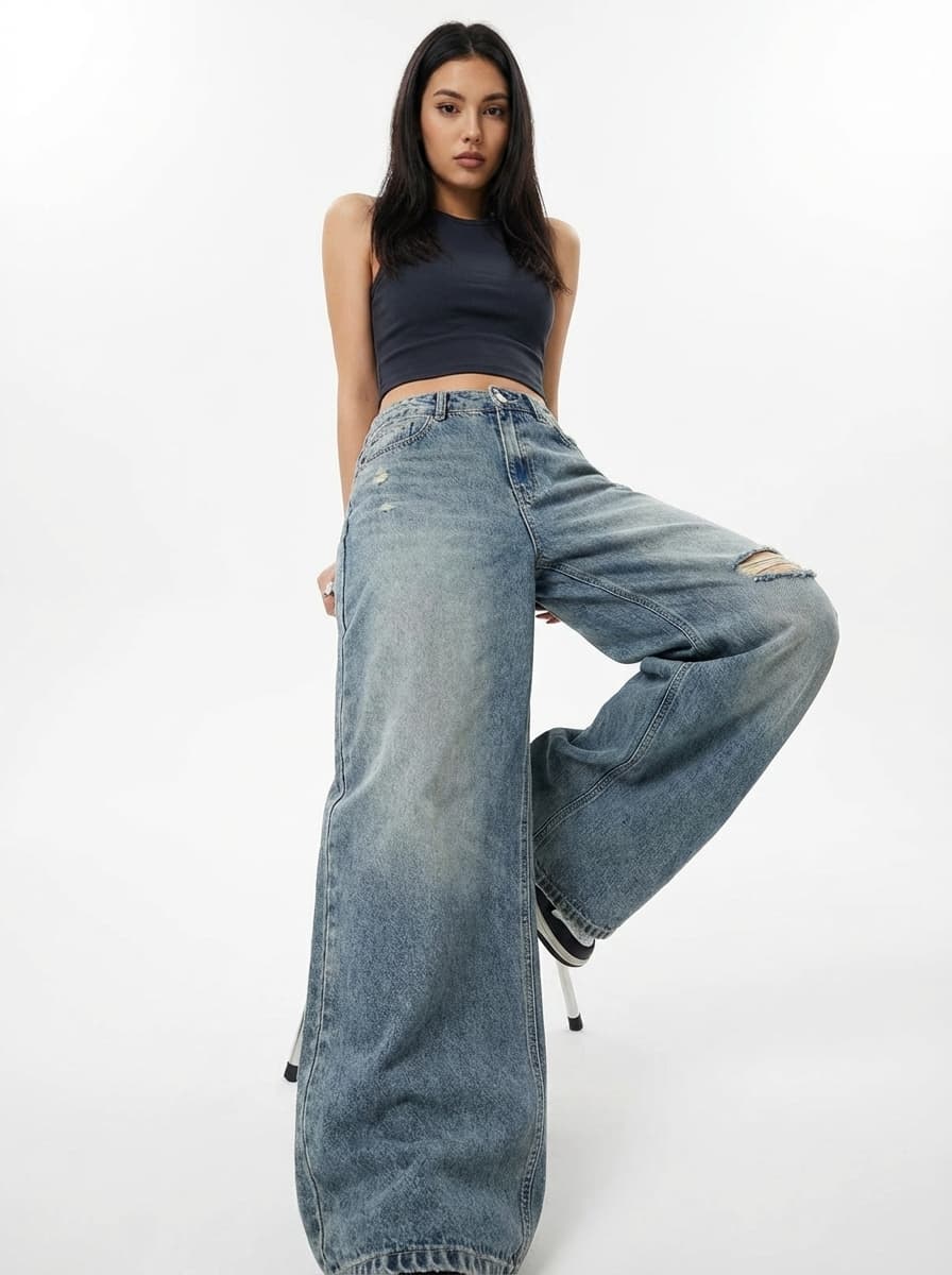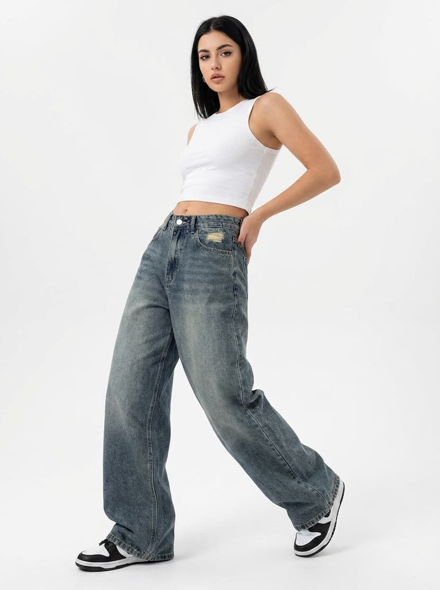 Широкие джинсы багги и гоночная куртка создают дерзкий аутфит в стиле Y2K. Идеальный streetwear лук для города и вечеринок. Почувствуй вайб ретро-рейсинга в этом комфортном демисезонном образе.