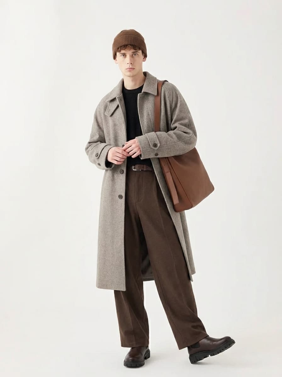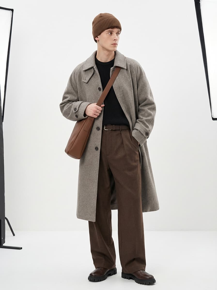 Шапка, свитер вязанный укороченный, ремень, брюки классические, пальто. Тренд весны и на осень для парней, ВБ
