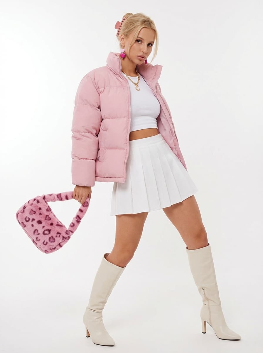 Розовый пуховик и теннисная юбка создают яркий образ в стиле Barbiecore. Идеальный демисезонный аутфит для прогулок и свиданий, дополненный сапогами на каблуке и трендовыми аксессуарами.