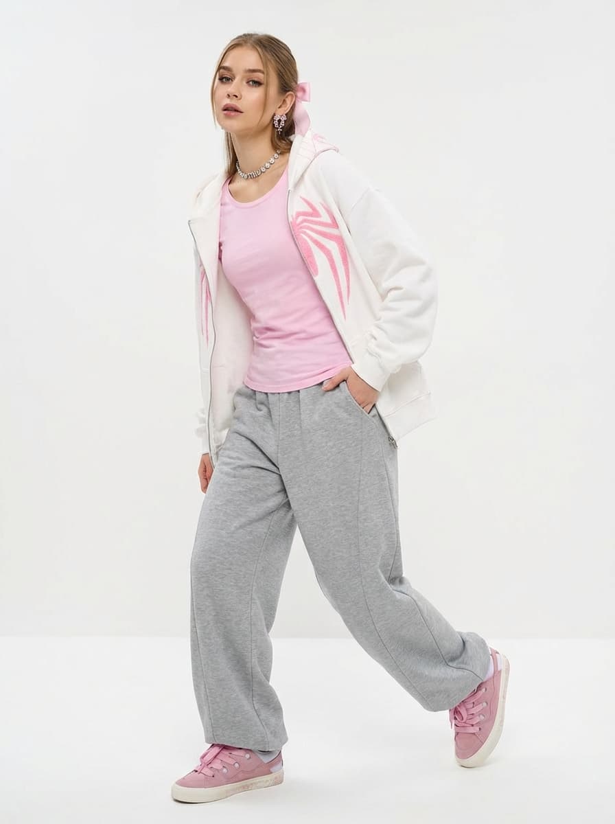 Streetwear образ в стиле Y2K и Coquette Core. Зипка Человек-Паук, широкие штаны и дутые кроссовки дополнены нежными бантами. Идеально для прогулок и встреч, создавая дерзкое и милое настроение.
