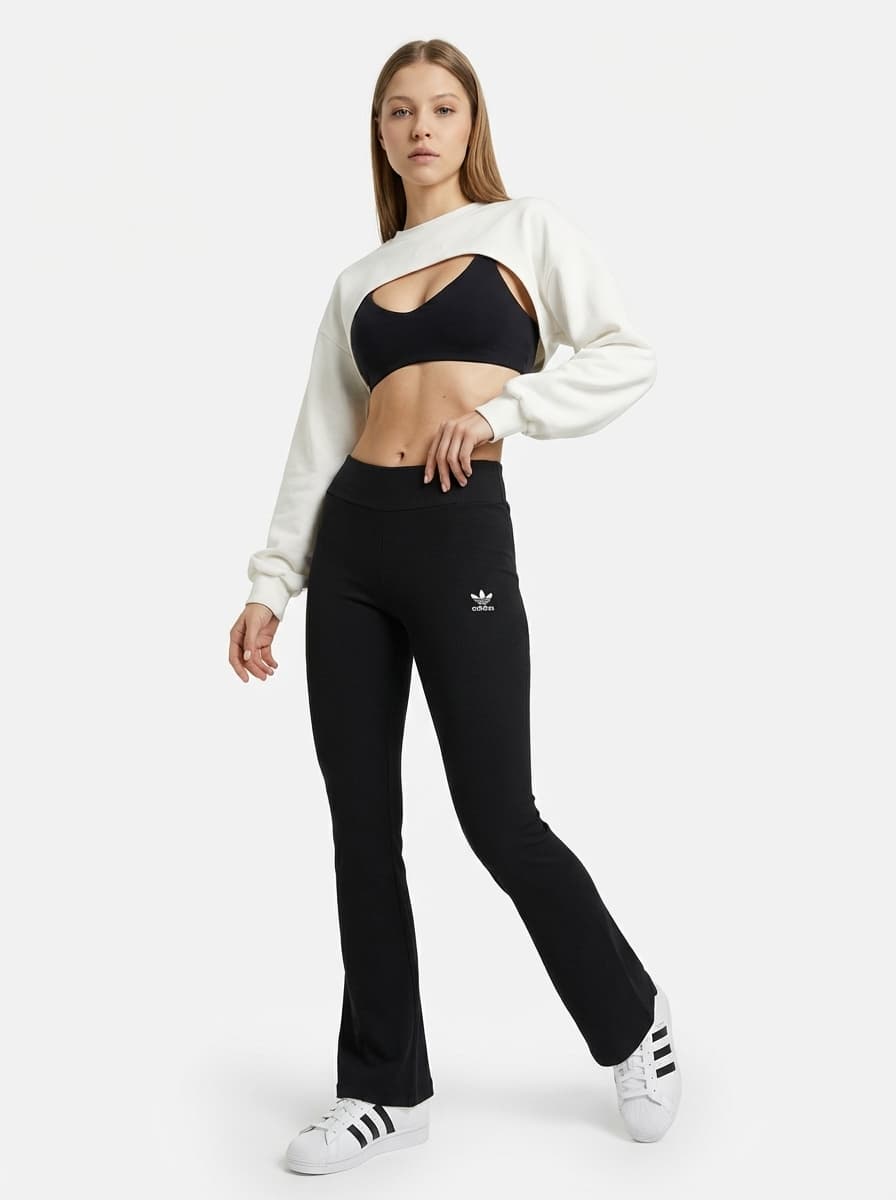 Спортивный образ для активного отдыха и прогулок: черные легинсы adidas, кроп-топ и белые кеды Superstar. Идеальное сочетание комфорта и трендового уличного стиля для уверенных в себе.