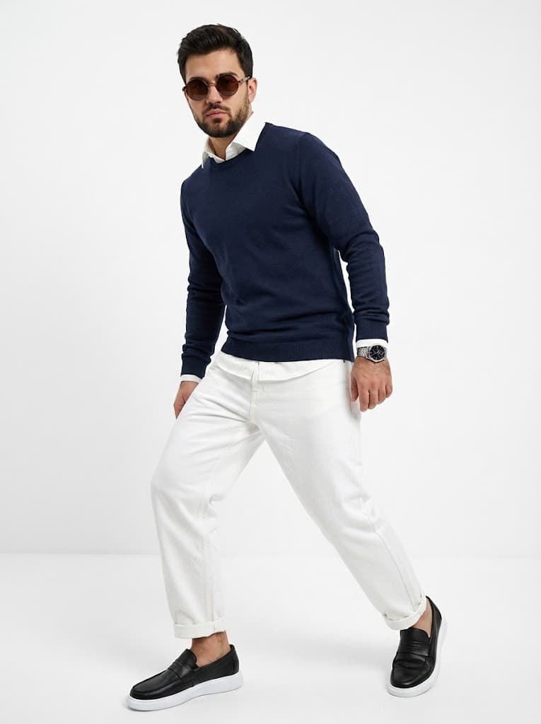 Мужской образ в стиле casual для встреч и прогулок. Тонкий синий свитер, белые джинсы-бананы и кожаные лоферы создают уверенное настроение. Идеальный выбор для стильной весны и осени.