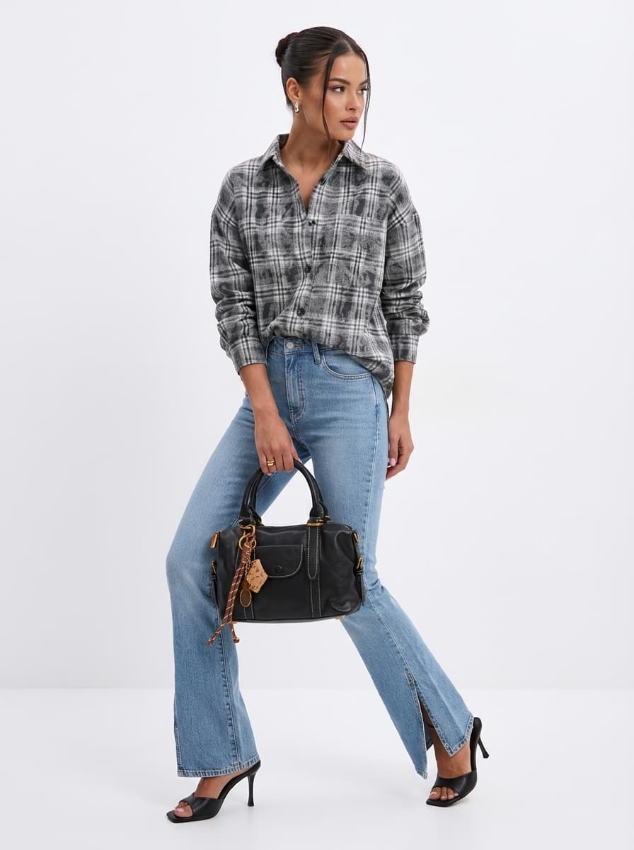 Джинсы с разрезами и фланелевая рубашка в клетку создают идеальный городской лук. Дополните образ изящными сабо и сумкой для встреч с друзьями или прогулок по городу. Трендовый деним и комфорт.