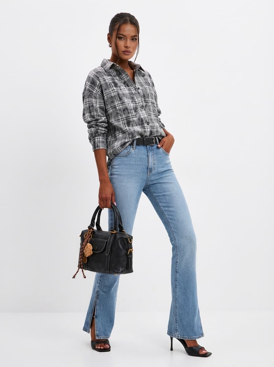 Стильный образ с клетчатой рубашкой и джинсами клеш