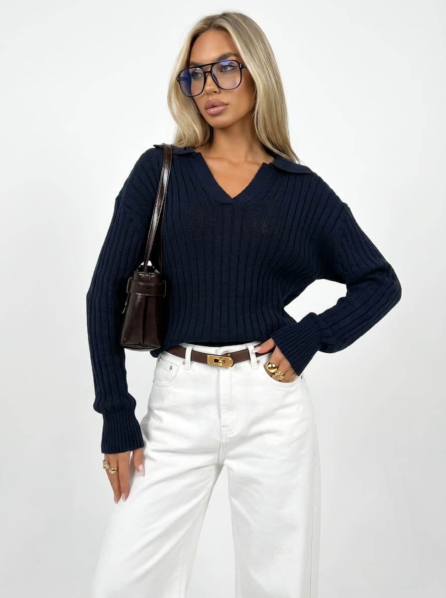 Трендовый образ в стиле Old Money: темно-синий вязаный свитер-поло и широкие белые джинсы. Идеально для прогулок и встреч, создает элегантное и уверенное настроение на каждый день.