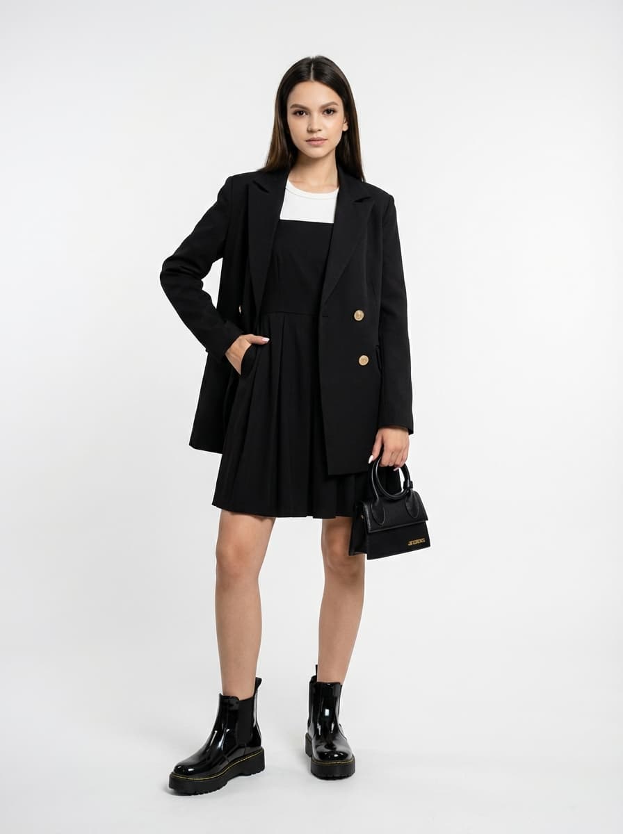 #женский#стильный аутфит#модные тренды#черный#базовый гардероб#демисезонная одежда#школьный образ#оверсайз пиджак#платье в складку#ботинки челси#лакированная обувь#dark academia#стиль преппи#осенний лук#jacquemus#подростковая мода