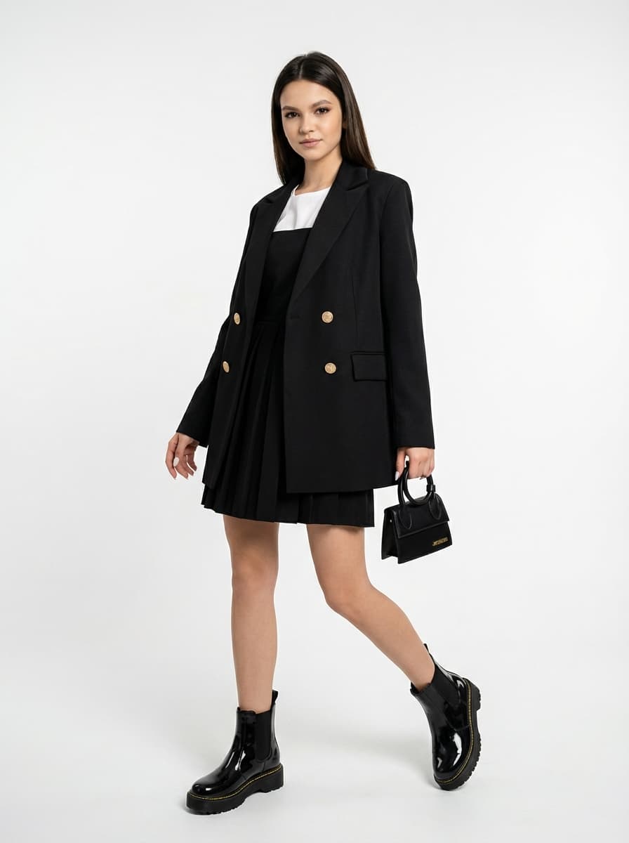 Школьный образ в стиле Dark Academia: черный оверсайз пиджак, лакированные ботинки и брендовая сумка. Идеально для учебы и прогулок, создавая дерзкое и уверенное настроение.