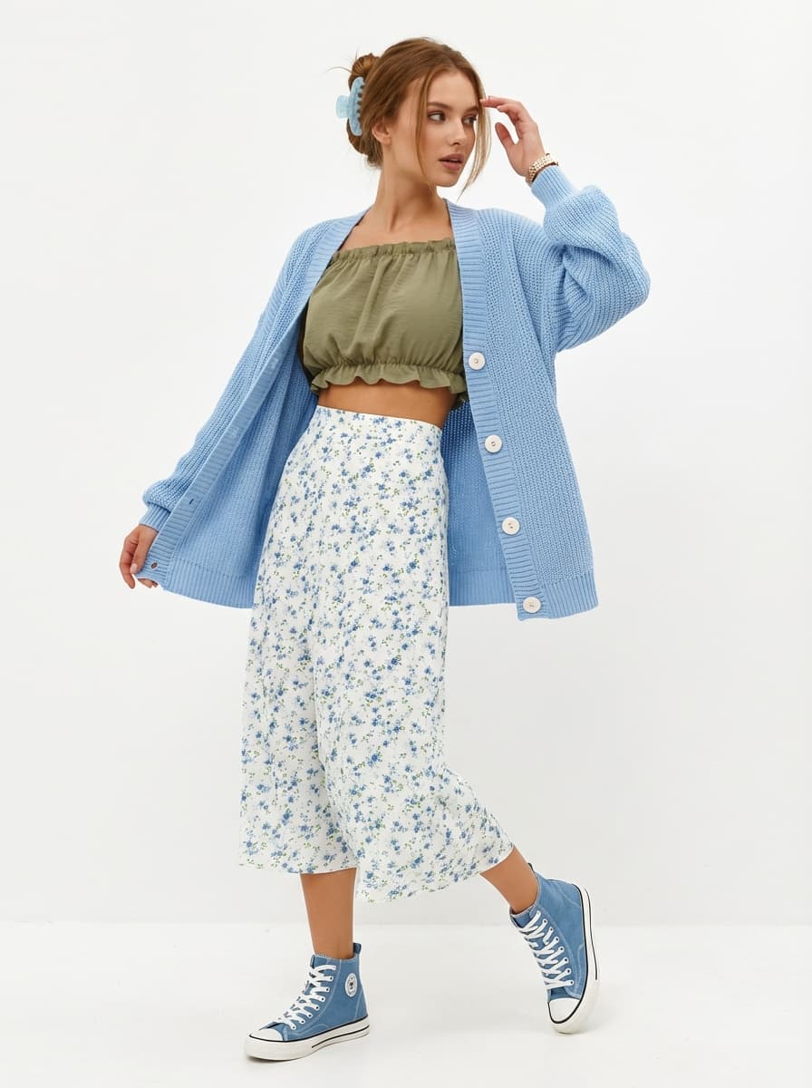 Повседневный женский образ с вязаным кардиганом, летней юбкой миди и высокими кедами. Идеальный лук для прогулок и встреч в стиле casual. Трендовые аксессуары подчеркнут ваше нежное настроение.