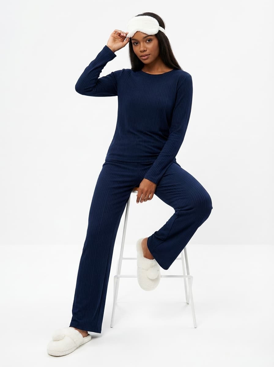 Синяя пижама из вискозы в сочетании с меховыми тапочками и маской для сна создаст атмосферу уюта. Идеальный домашний комплект для расслабленного вечера, сна и качественного отдыха.
