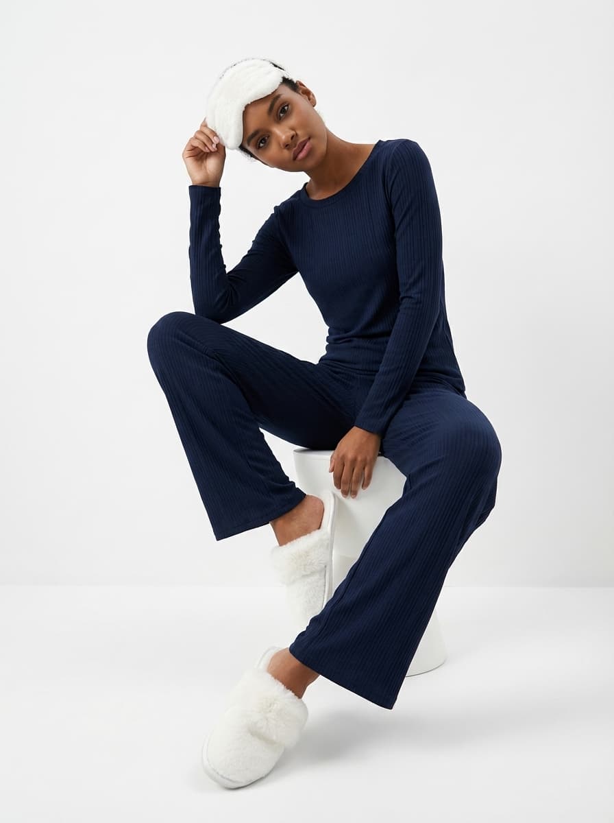Уютный домашний образ: синяя пижама и пушистые аксессуары