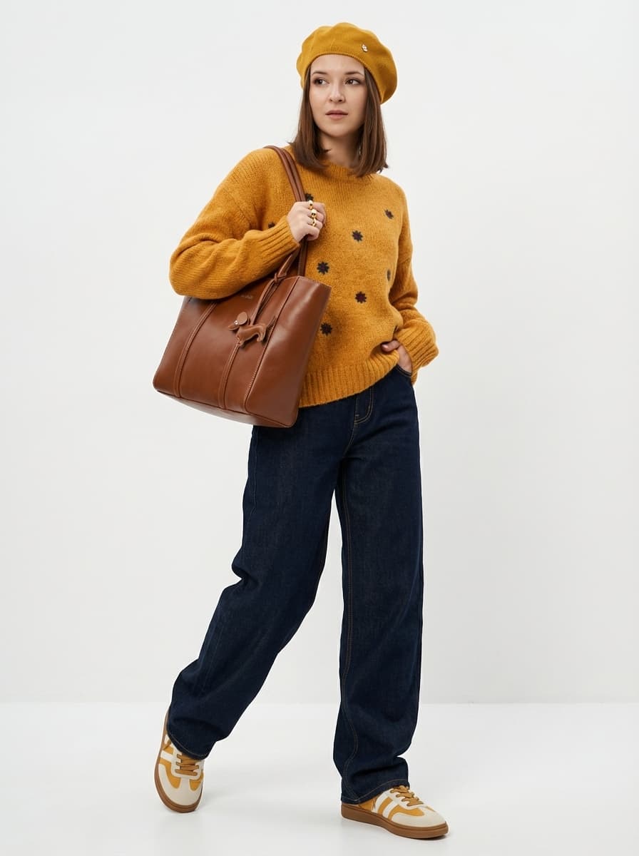 Стильный горчичный лук для города. Объемный вязаный свитер, широкие джинсы индиго и берет создают уютное настроение для прогулок. Трендовый аутфит с акцентом на комфорт и яркие цвета осени.