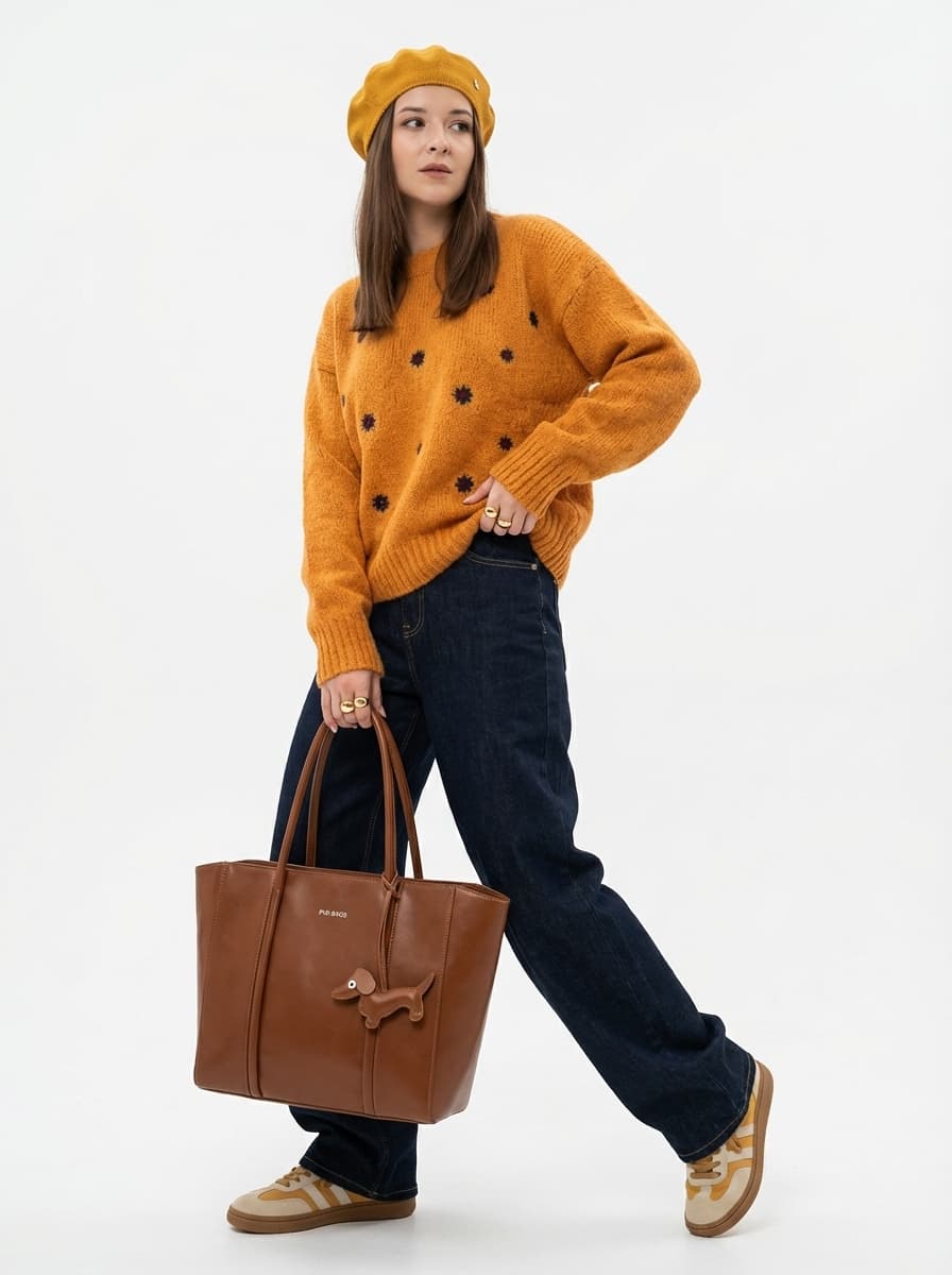 #женский#коричневый#синий#деним#уличная мода#широкие джинсы#повседневный стиль#бижутерия#багги#большая сумка#кеды#осенний лук#кольца#замша#оверсайз свитер#оранжевый#желтый#горчичный#индиго#берет