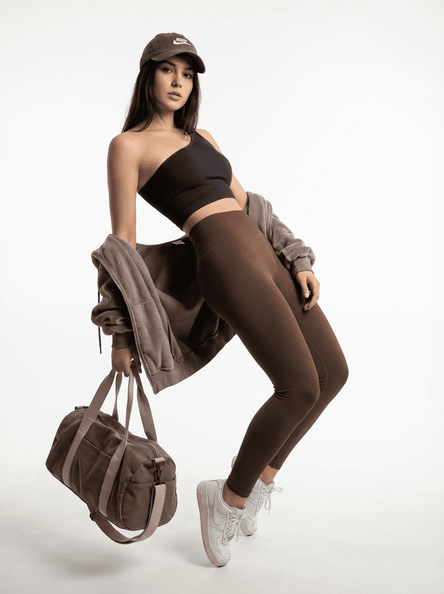 Спортивный стиль и комфорт: коричневые леггинсы в рубчик в сочетании с бежевой плюшевой толстовкой и кроп-топом. Идеальный женский аутфит для прогулок и активного отдыха в демисезон.