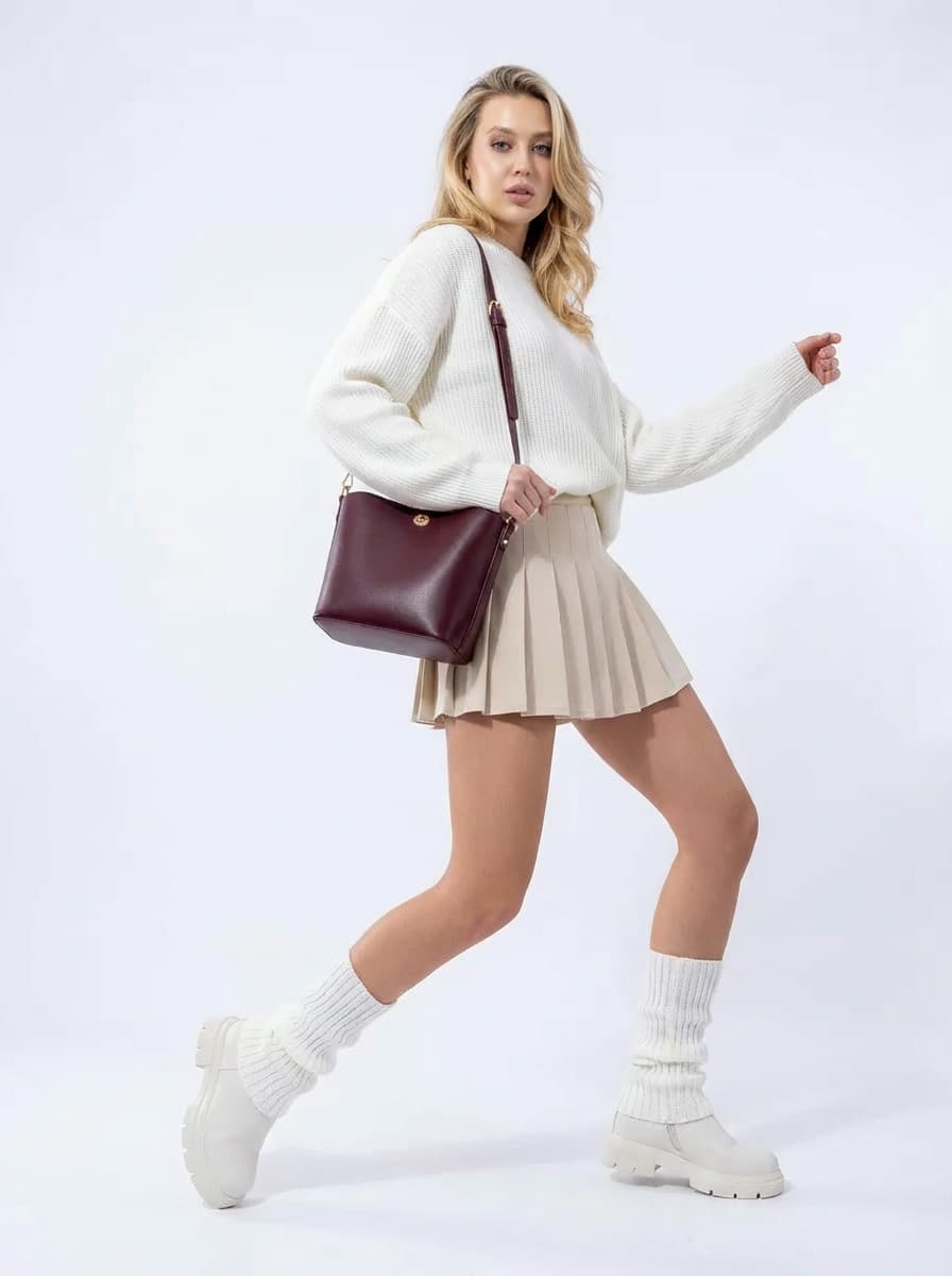 #женский#зима#коричневый#бежевый#осень#уличная мода#повседневный стиль#теннисная юбка#белый#бордовый#джемпер оверсайз#юбка-шорты#зимние сапоги#гетры y2k#сумка ведро#сумка тоут#теплый образ#преппи#уютный аутфит