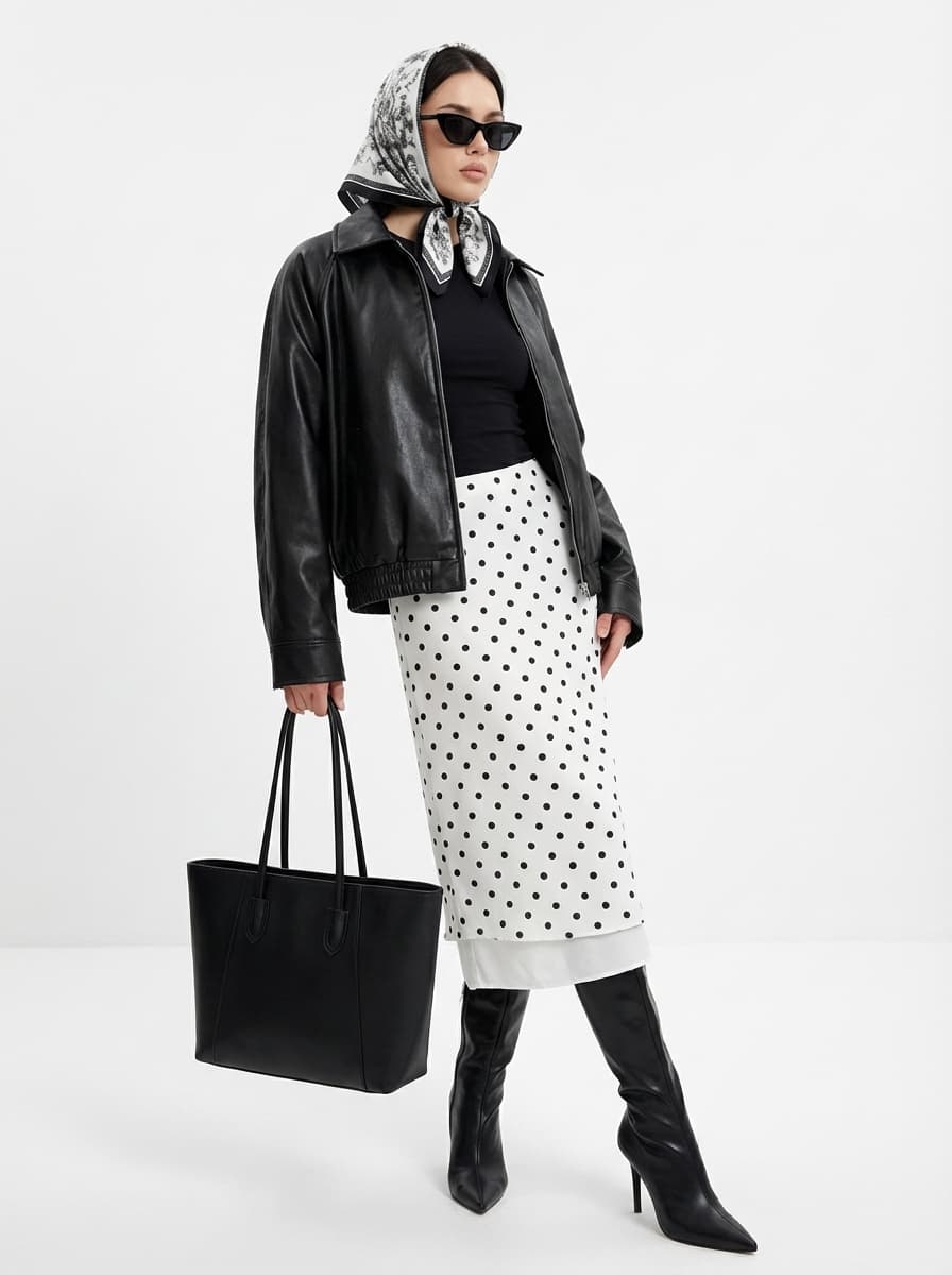 Стильный женский образ: кожаный бомбер и юбка в горошек. Идеальный демисезонный лук 2026 для офиса и свиданий, сочетающий элегантность и дерзкий стритстайл. Будьте в центре внимания!